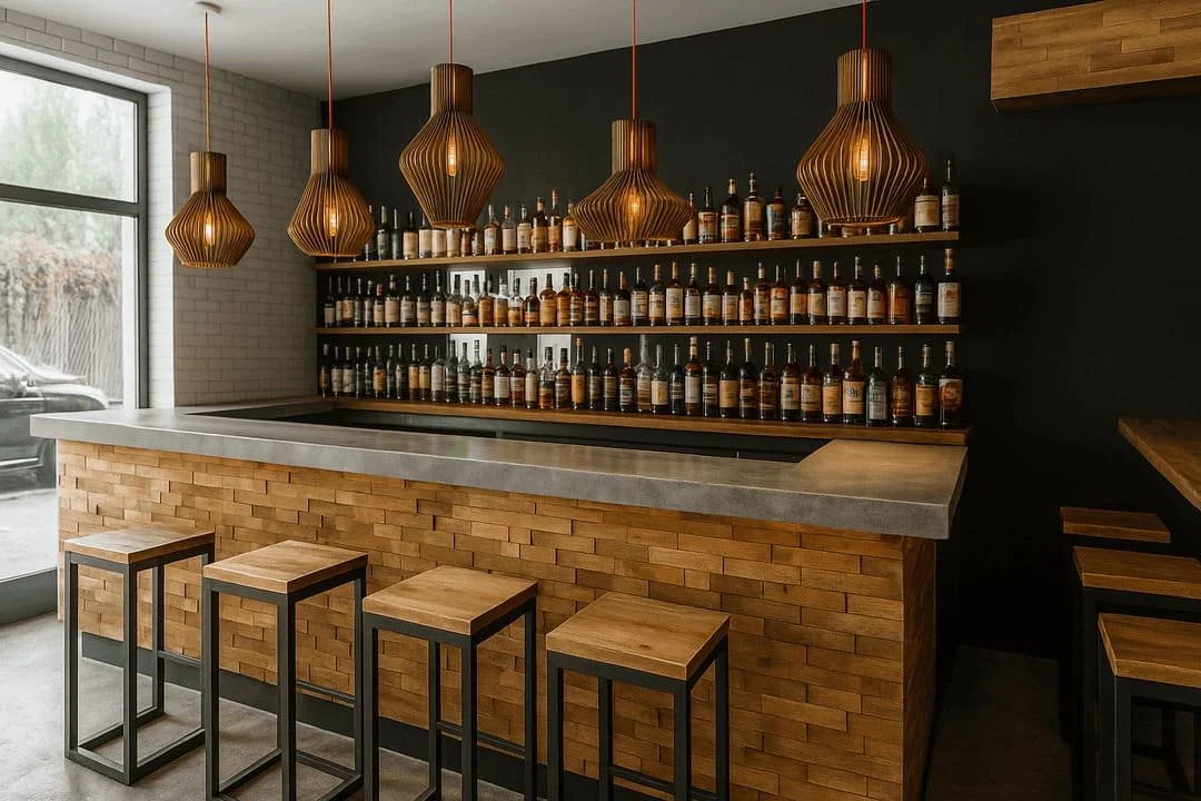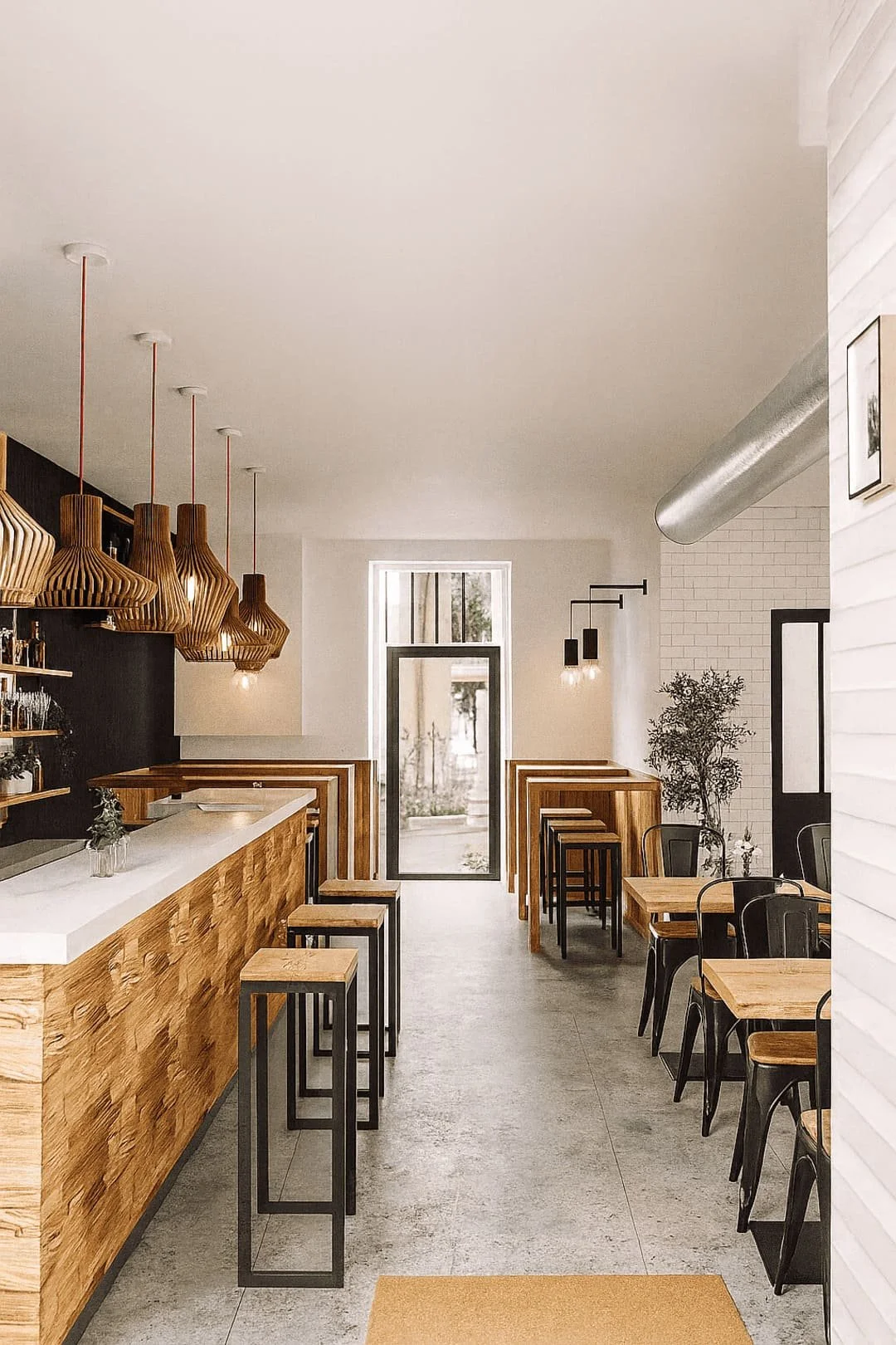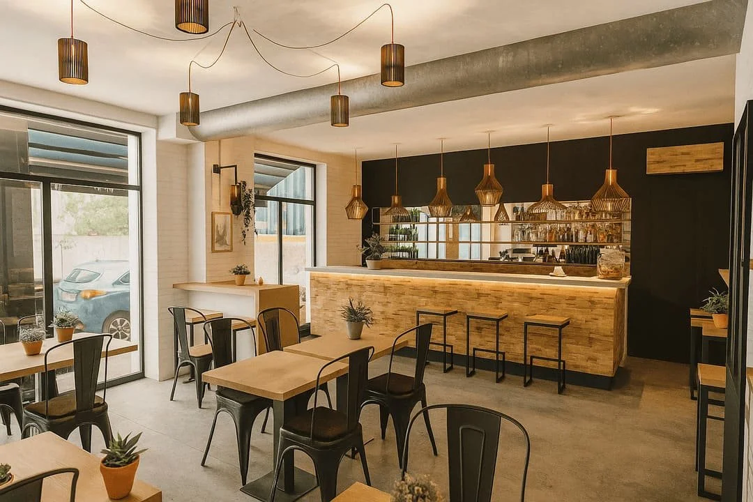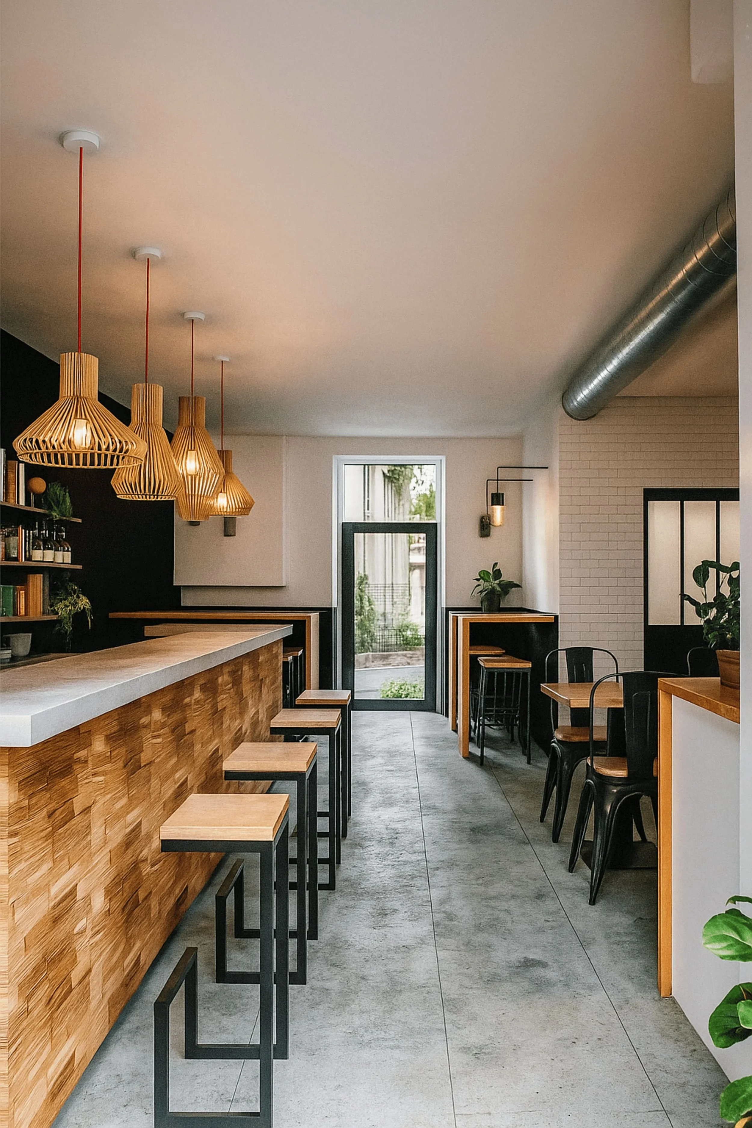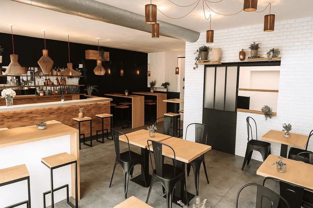 Des suspensions lumineuses sur mesure viennent éclairer l'espace, tandis que le bar a été entièrement rénové, revêtant désormais une allure élégante et moderne. Le sol, autrefois dégradé, a été recouvert d'un carrelage effet béton brut, tandis que des carreaux métro ont été ajoutés sur certains murs pour apporter une touche d'authenticité et de caractère.
